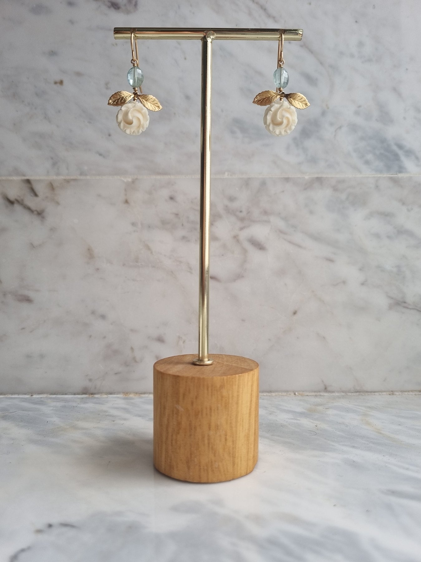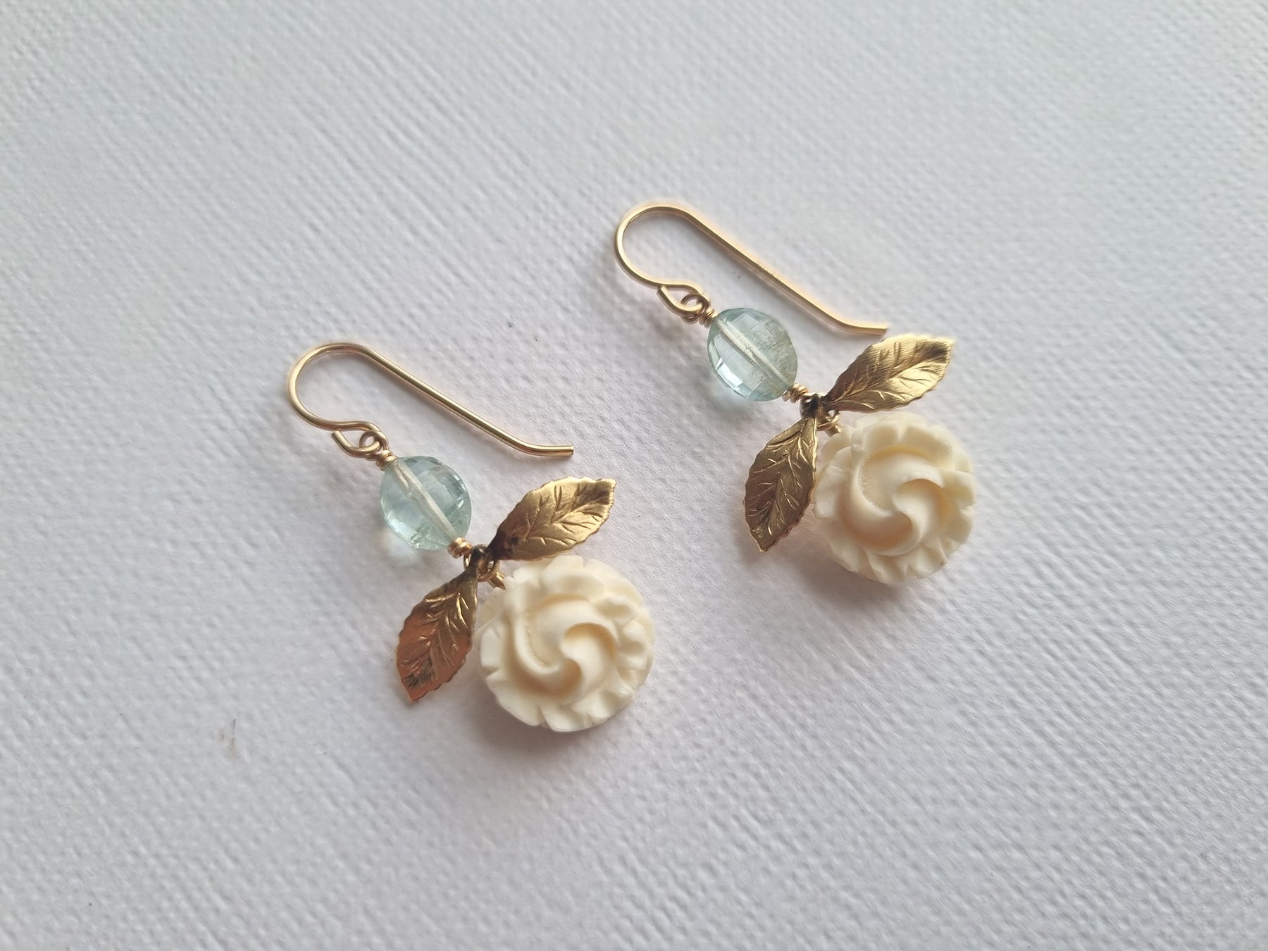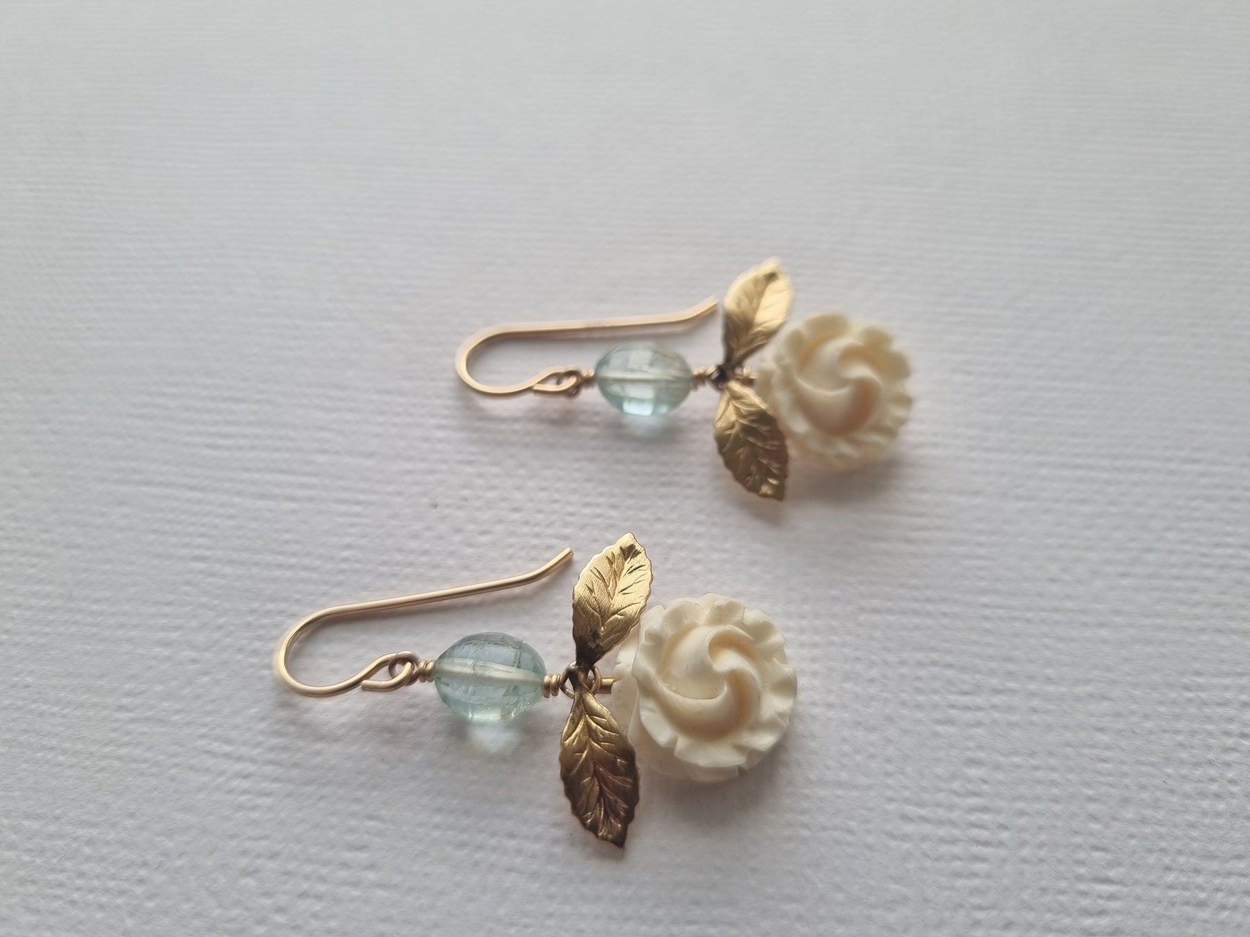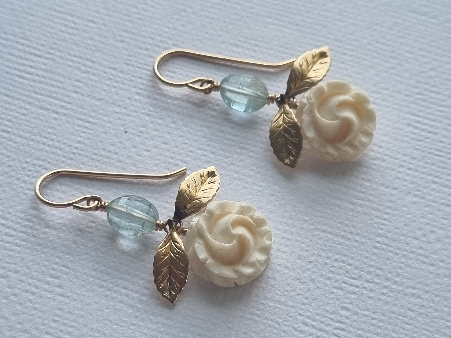 Regular price $228 USDVery pretty vintage gold-filled handcarved roses are paired with gorgeous cushion-cut aquamarine gemstones in these fun and swingy earrings!