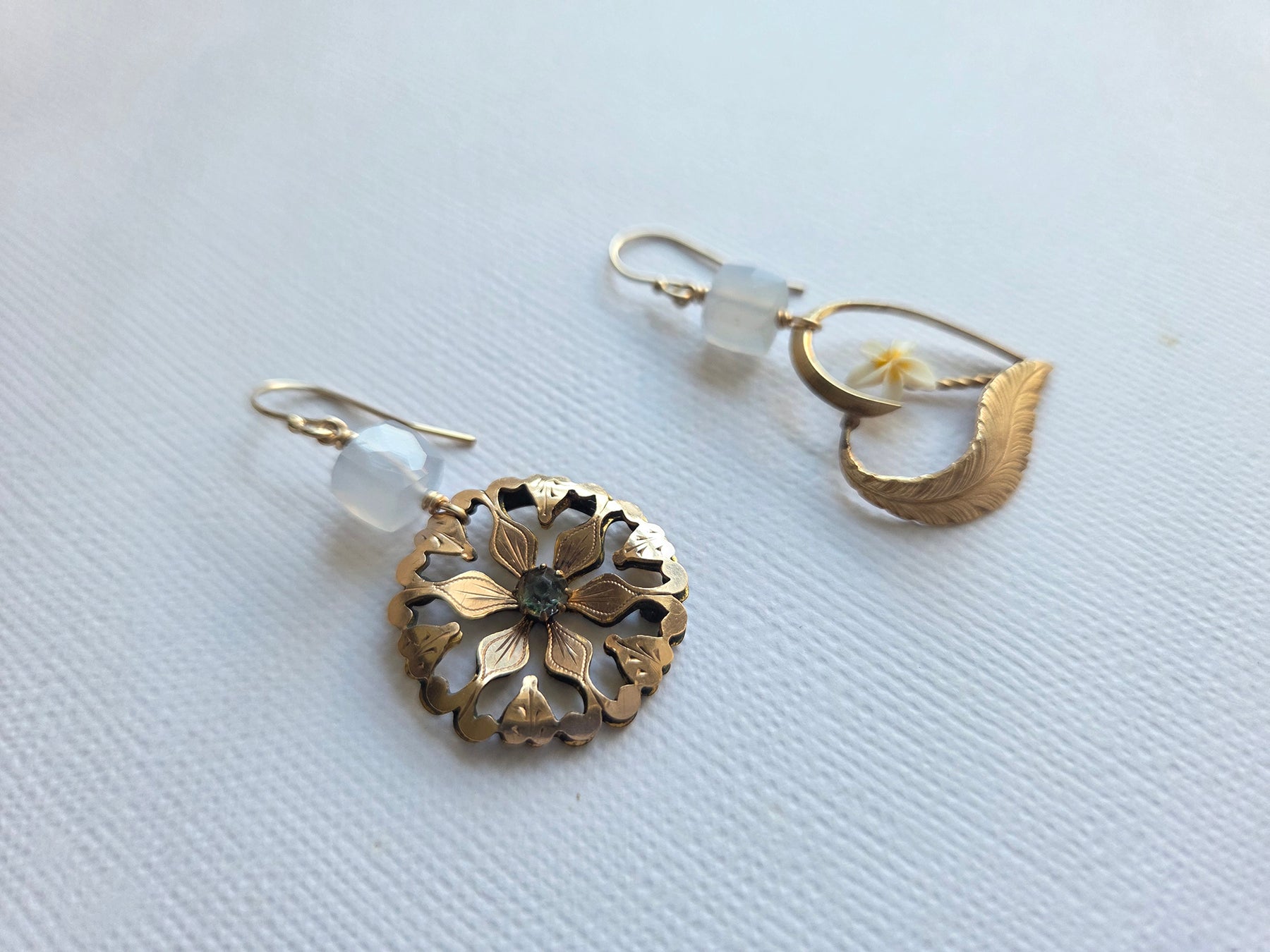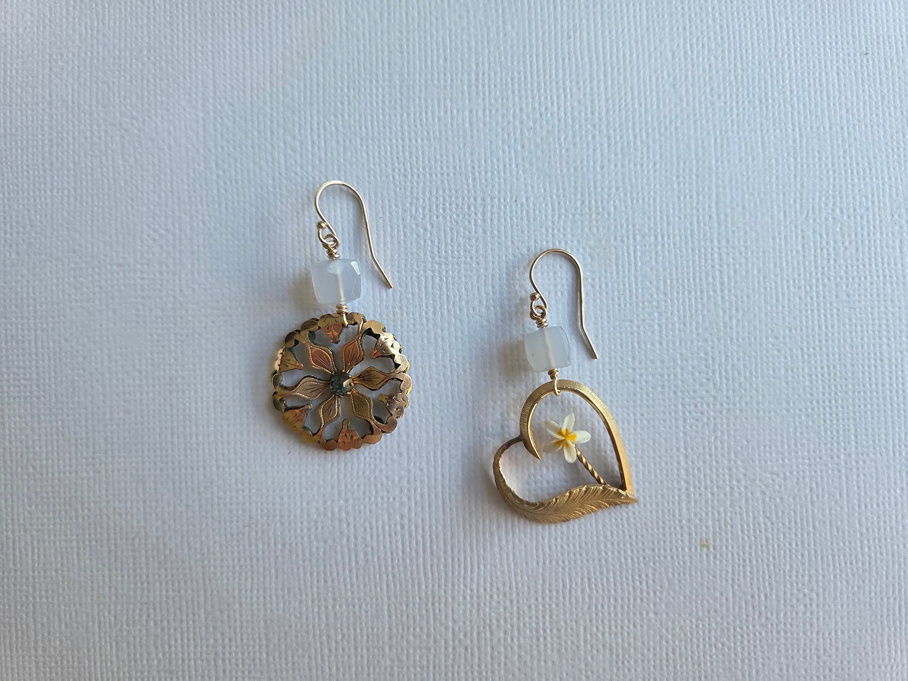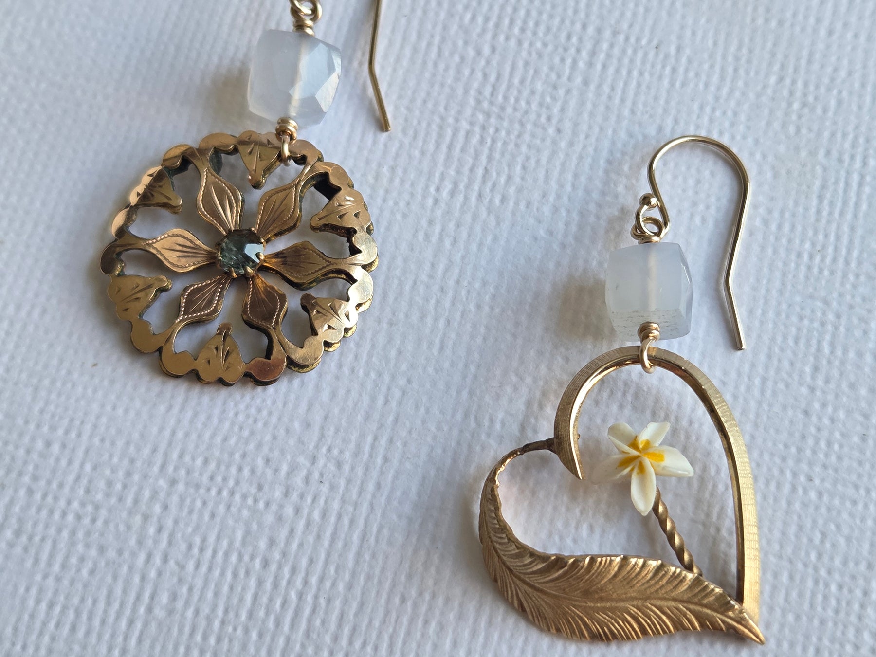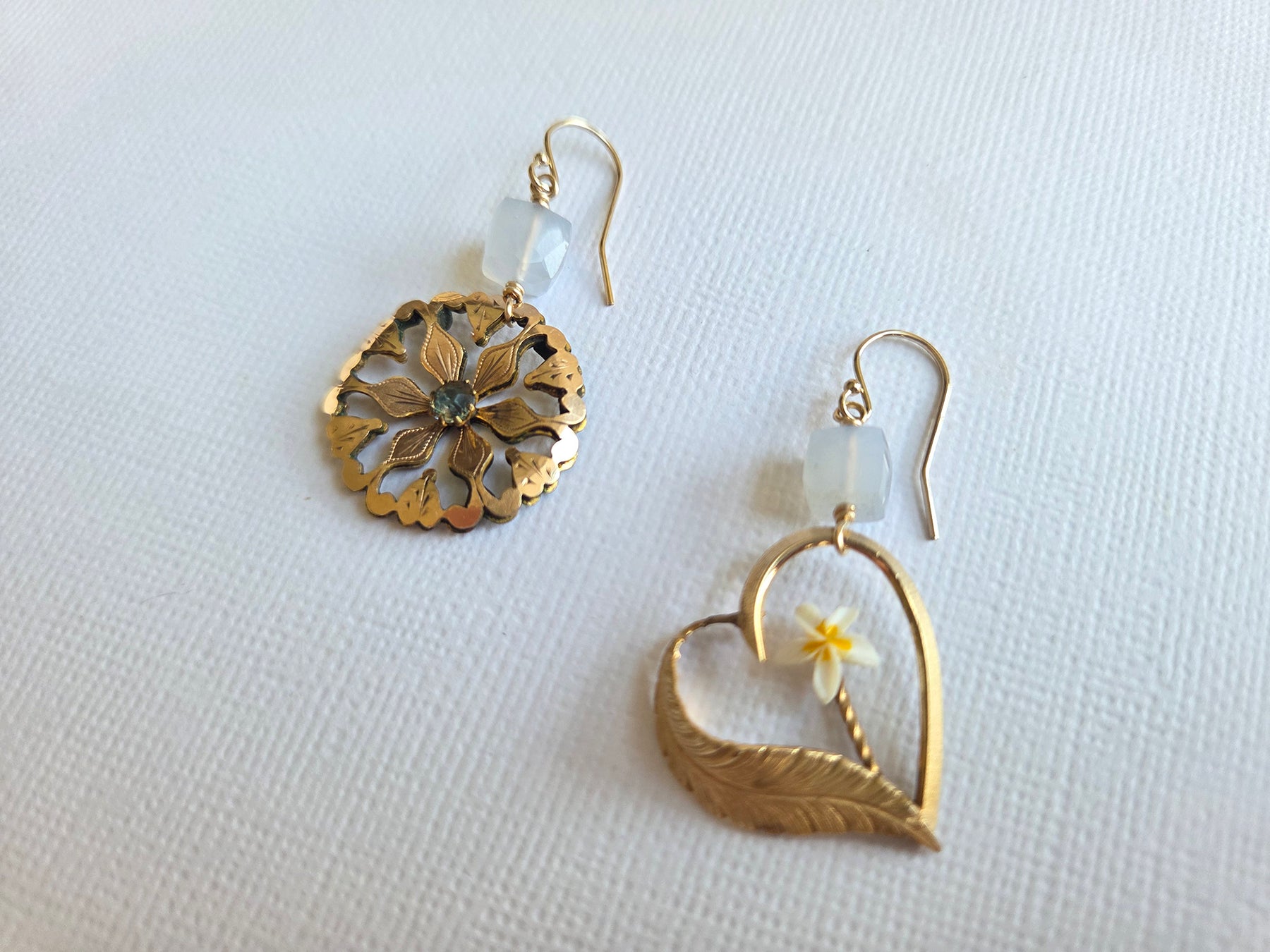 Regular price $373.43I love making these mismatched yet somehow artistically linked earrings featuring treasures from different centuries! This pair features a vintage gold-filled heart brooch with a bright, cheery flower, paired with an antique gold-filled brooch with leaf motifs and a central sparkly paste stone. Topped off with chalcedony cubes on 14K gold-filled earwires, these fun and swiny earrings take you from work to play!