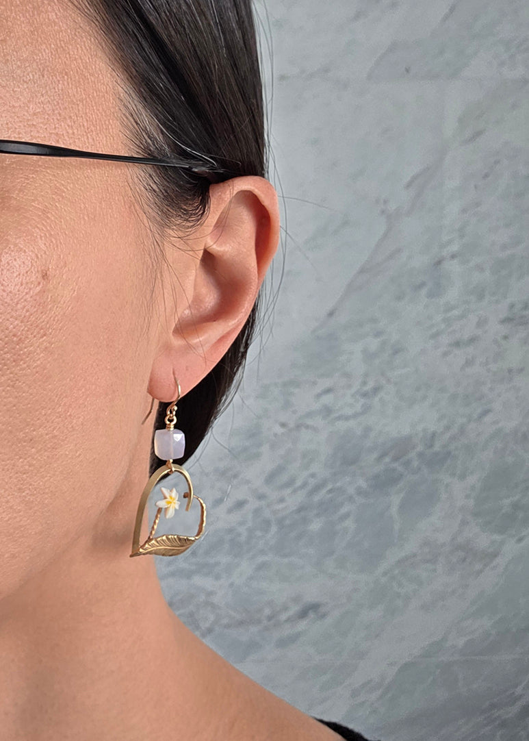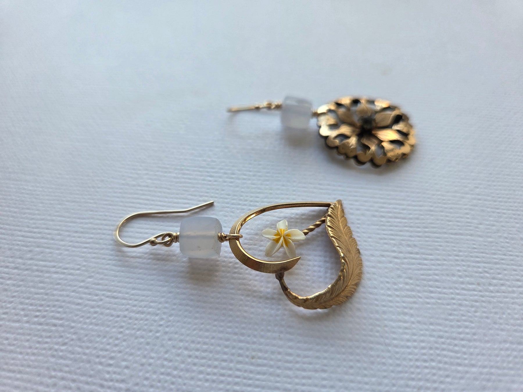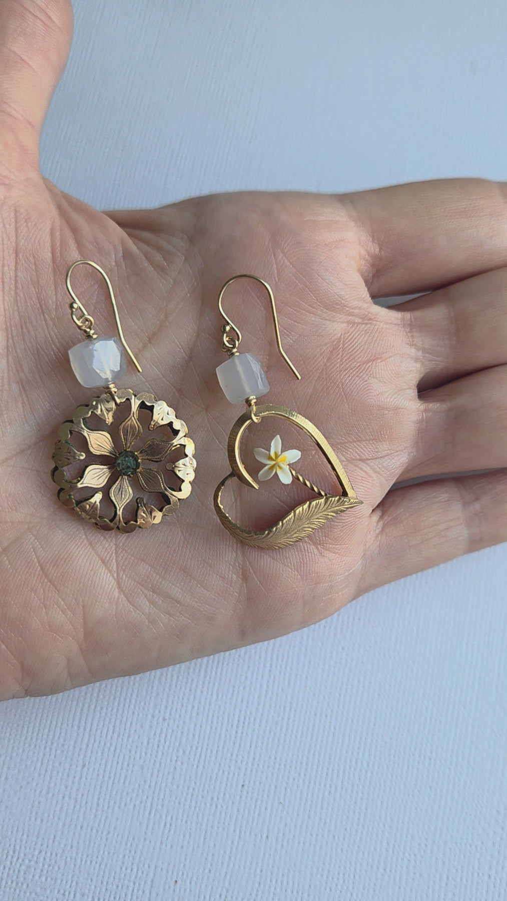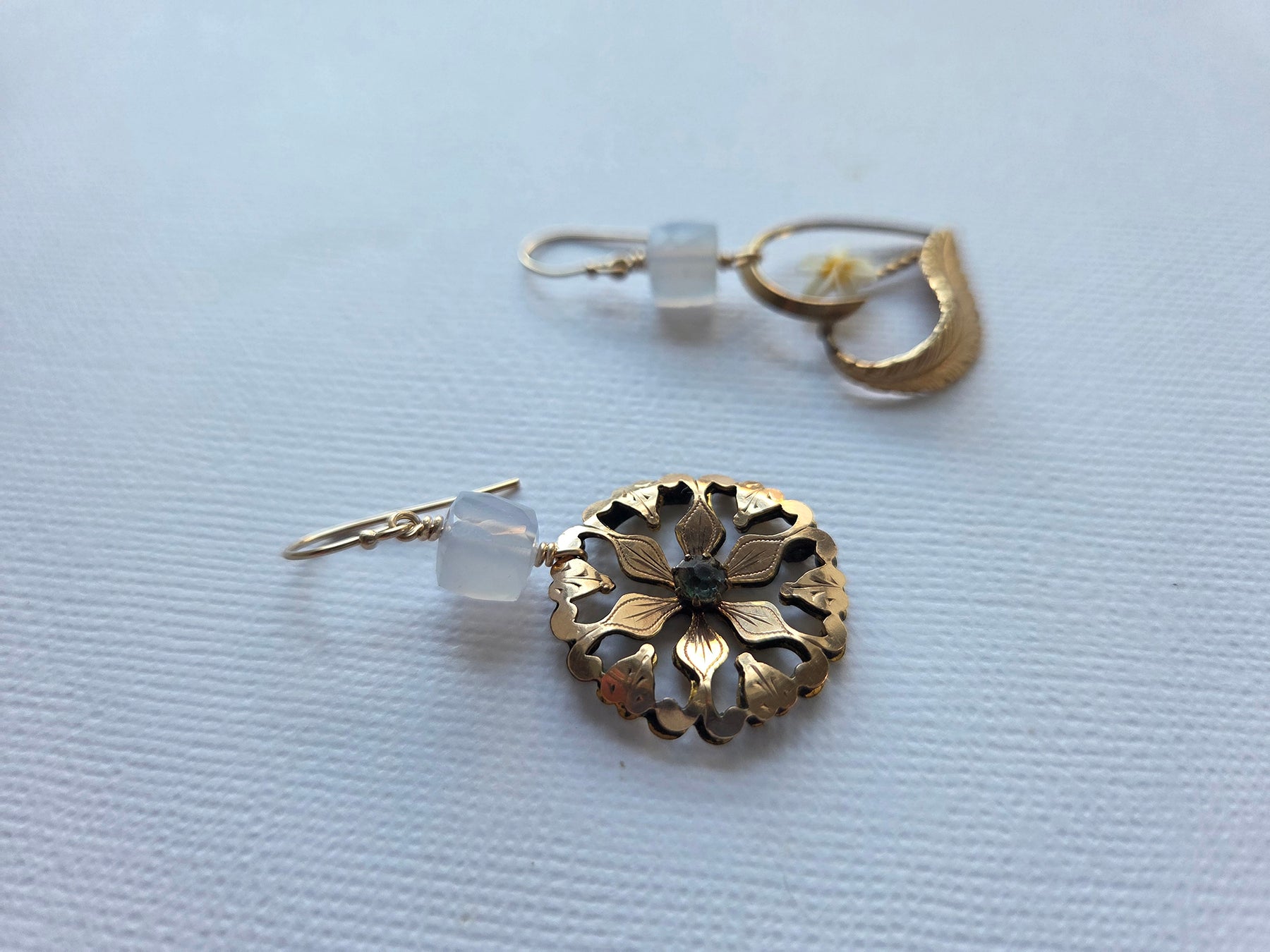 Regular price $373.43I love making these mismatched yet somehow artistically linked earrings featuring treasures from different centuries! This pair features a vintage gold-filled heart brooch with a bright, cheery flower, paired with an antique gold-filled brooch with leaf motifs and a central sparkly paste stone. Topped off with chalcedony cubes on 14K gold-filled earwires, these fun and swiny earrings take you from work to play!