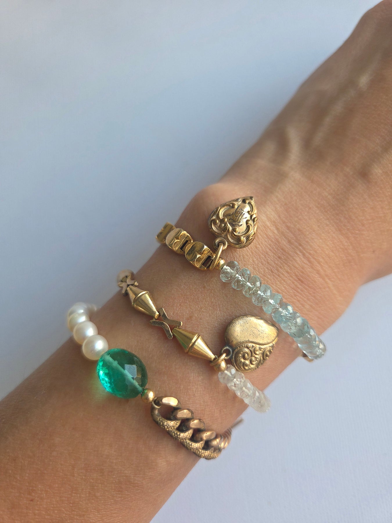Regular price 1,033.42 NISOur one-of-a-kind gold-filled vintage watch band bracelets are a versatile and unique way to add a little something extra to your look. This bracelet features a gorgeous vintage gold-filled watch band with sweet heart links! I paired it with a row of pale blue aquamarine gemstones and a beautiful, ornate and puffy antique gold-filled heart charm that is inscribed a monogram ("h"?). This beautiful statement bracelet is perfect for stacking or to stand out all on its own! Vintage watch band is hallmarked as gold-filled.