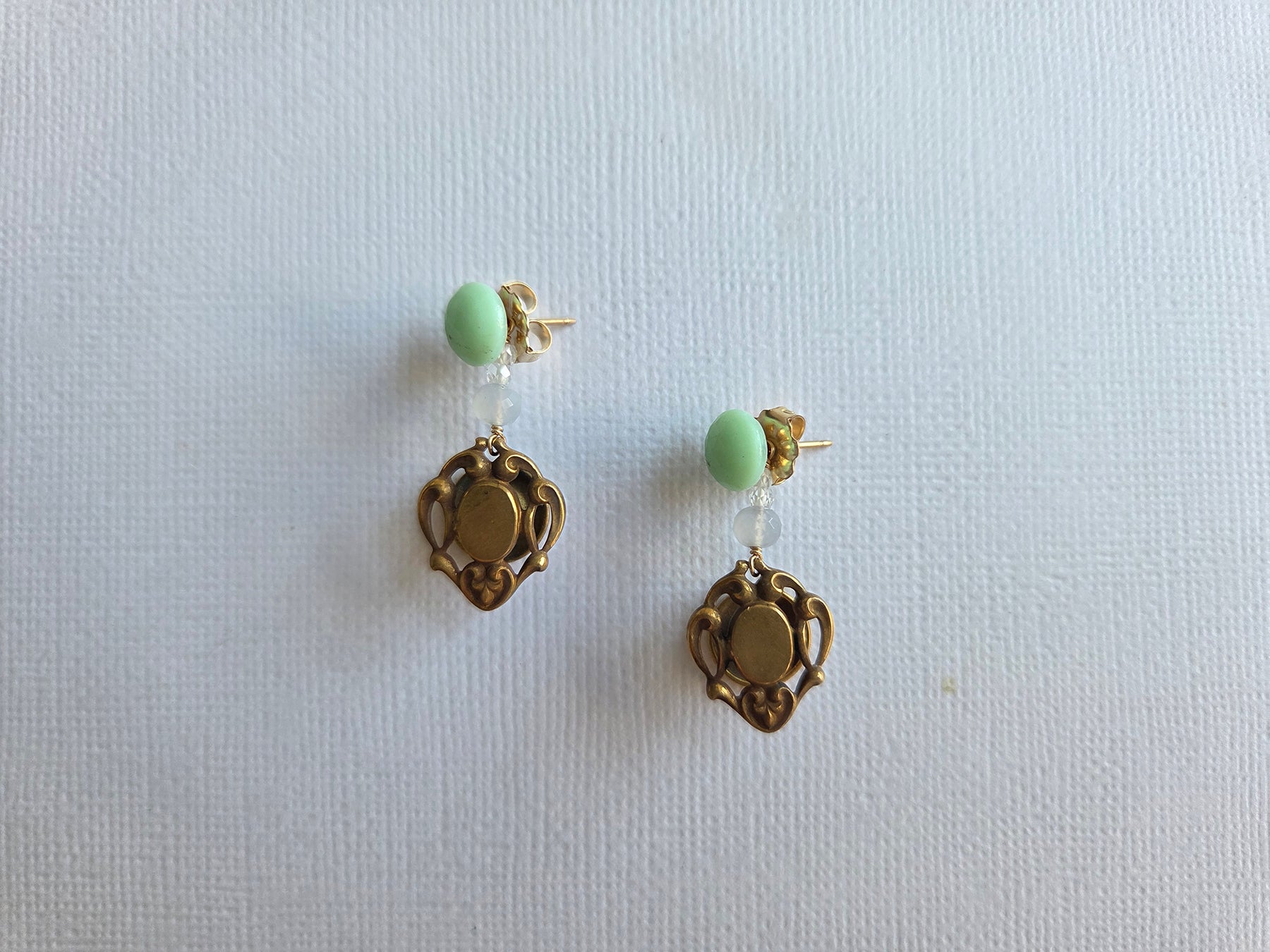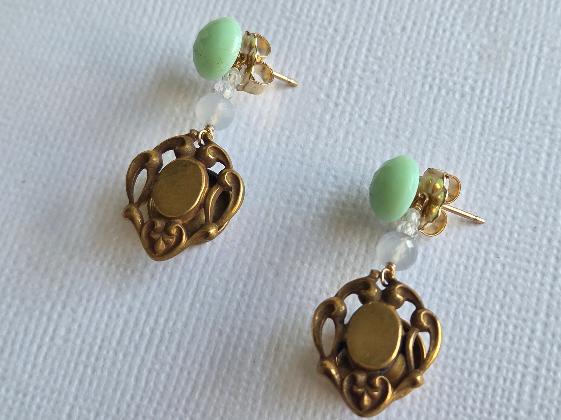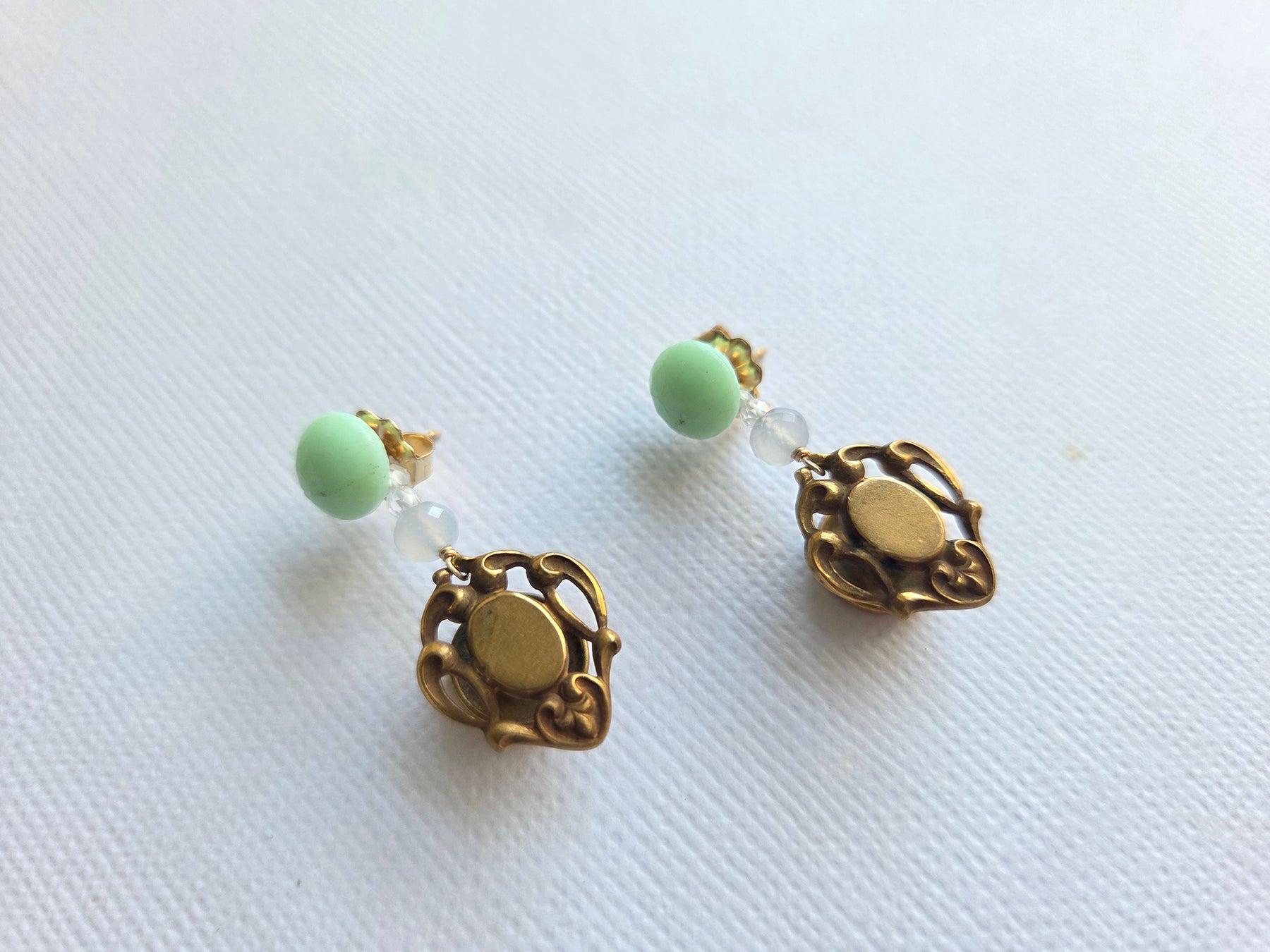 Regular price $348 USDOne of my favourites of the new collection, they feature beautiful, ornate antique gold-filled cufflinks! I always love to imagine the Victorian gentlemen who may have worn these amazing artifacts. I handwired them with pale, glowing blue chalcedony and white sparkly zircons, on pale mint green glass bead studs. The dangles can be taken off so that you can also wear the studs alone! I just love these mint green studs and these are my last pair. Note that these vintage glass beads have some darker flecks on them (please see the pictures). A piece you will wear and treasure, for sure!