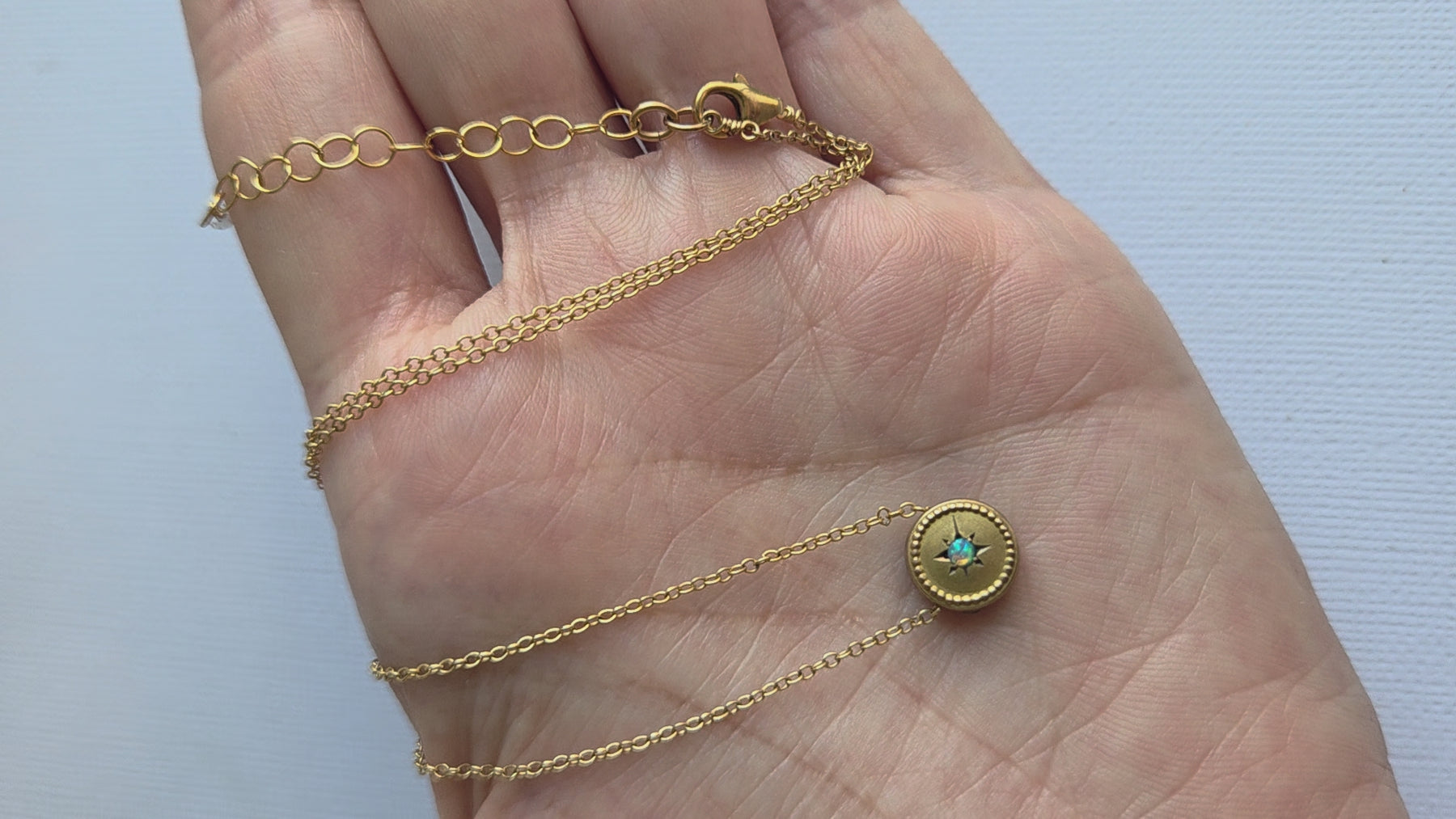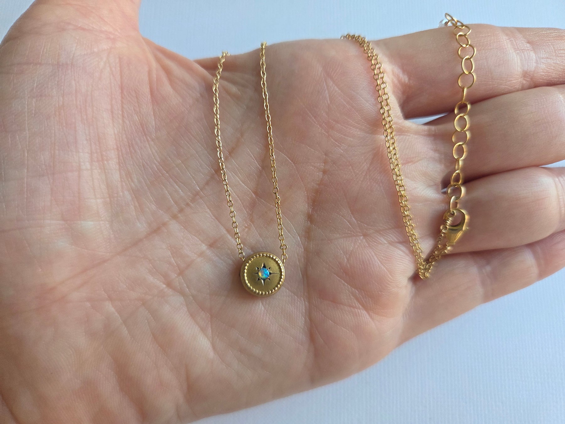 All metal is gold-filled. Measures about 14 inches (35.5 cm) around at the shortest, with a 2 inch (5 cm ) extender.